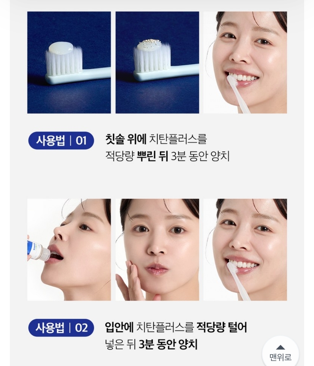 사용법은 간단하지만 효과를 극대화하려면 정확히 사용하는 것이 중요합니다. 칫솔에 치약을 짜고, 그 위에 치탄플러스를 완두콩 크기로 올려 양치합니다. 하루 2~3회 권장되며, 민감한 잇몸을 가진 분은 초기 사용 시 주의가 필요합니다.